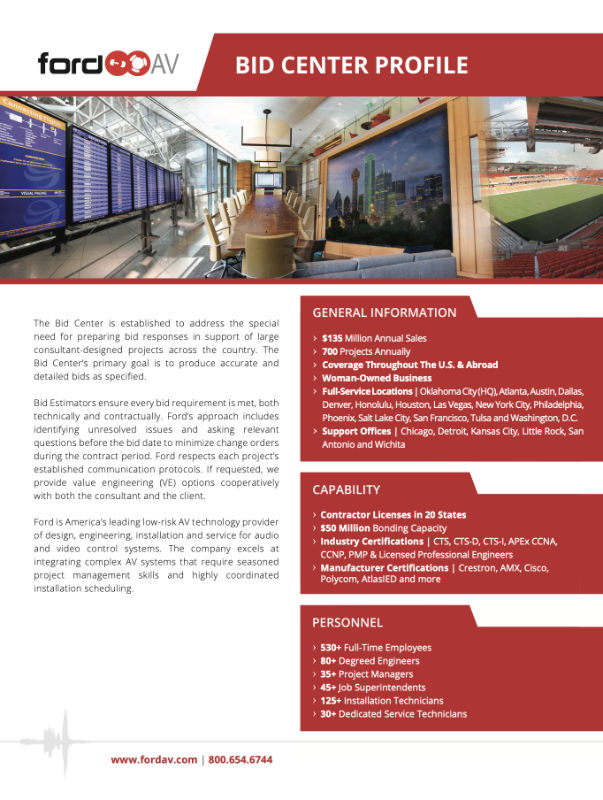 The Ford AV Bid Center is dedicated to supporting large consultant-designed projects across the country with meticulous and accurate bid responses. Our primary goal is to ensure every bid requirement is met, both technically and contractually, delivering value and reliability to your projects.