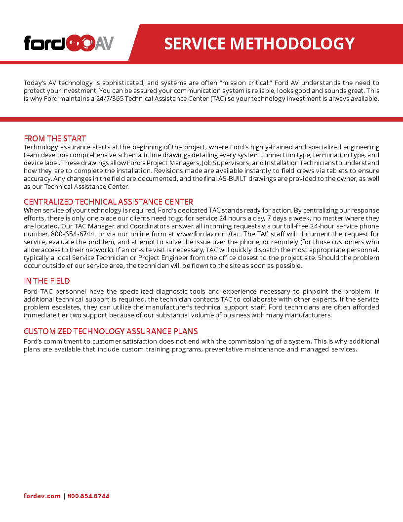 Ford AV provides a 1-to-5-year break/fix service warranty with each installation, supported by a toll-free 24/7 service hotline providing access to highly-trained technicians and engineers to quickly resolve any technology issue you encounter.