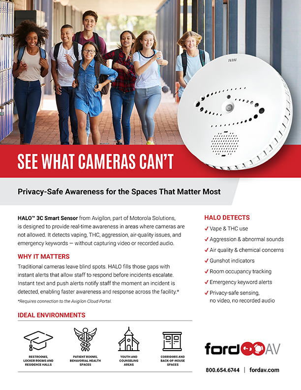 HALO™ 3C Smart Sensor from Avigilon, part of Motorola Solutions, is designed to provide real-time awareness in areas where cameras are not allowed. It detects vaping, THC, aggression, air-quality issues, and emergency keywords — without capturing video or recorded audio.